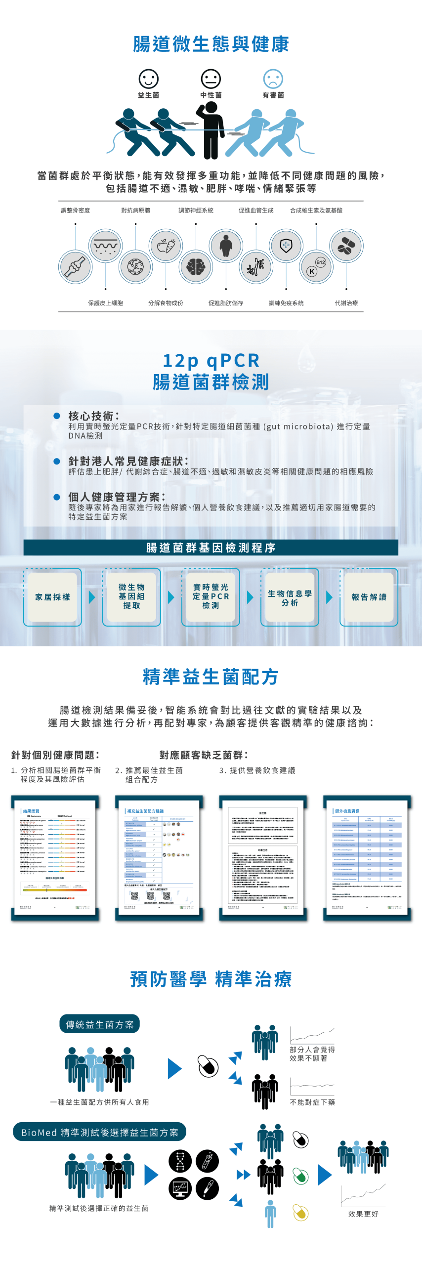 愈來愈多研究發現腸道微生物對人體各方面健康的影響,包括腸道健康、免疫及代謝問題、肥胖、過敏濕疹、甚至癌症。 很多常見的康問題患者所缺乏的腸道益生菌都有所不同。精準補充益生菌,改善健康問題。BIOMED腸道菌群核酸檢測,解構您體內的「腸道密碼」,評估患上相關健康問題的風險,提供營養飲食建議,專家解讀報告,及建議個人化益生菌組合。